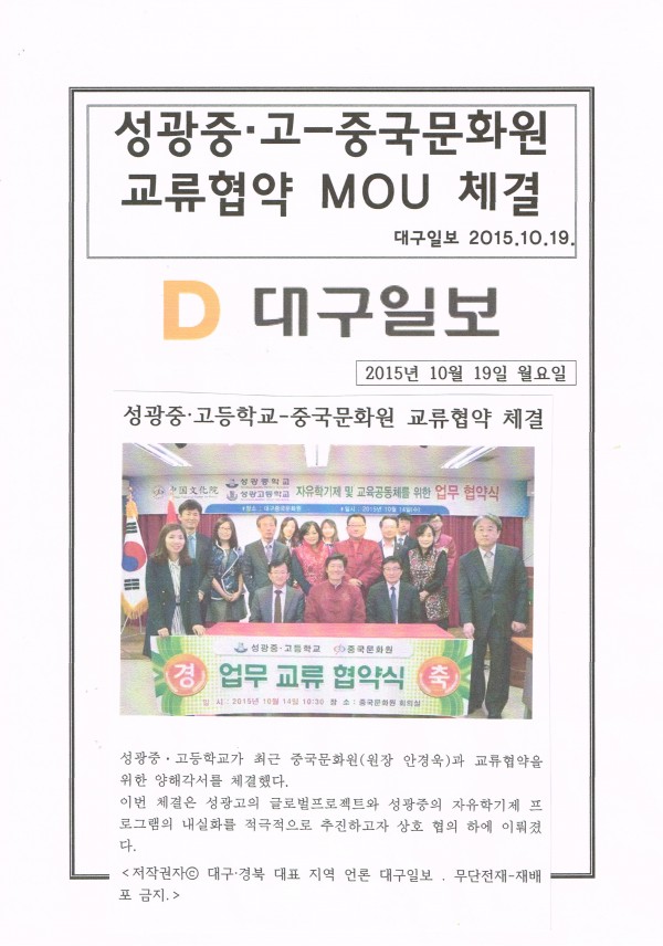 2015.10.19 대구일보) 중국문화원-성광중고등학교 교류협약 MOU체결 페이지 정보 작성자 중국문화원 작성일15-11-13 16:39 조회2,647회 댓글0건 이전글 다음글 본문 댓글목록 등록된 댓글이 없습니다. 이전글 다음글