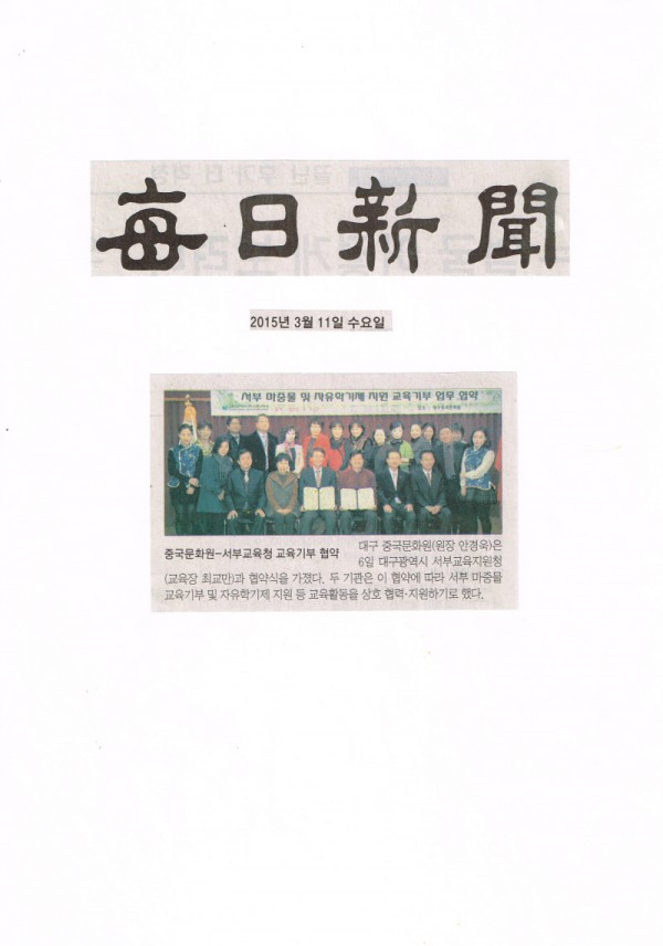 2015.3.11 매일신문) 중국문화원-서부교육청 교육기부 협약 페이지 정보 작성자 중국문화원 작성일15-05-08 10:51 조회2,646회 댓글0건 이전글 다음글 본문 댓글목록 등록된 댓글이 없습니다. 이전글 다음글