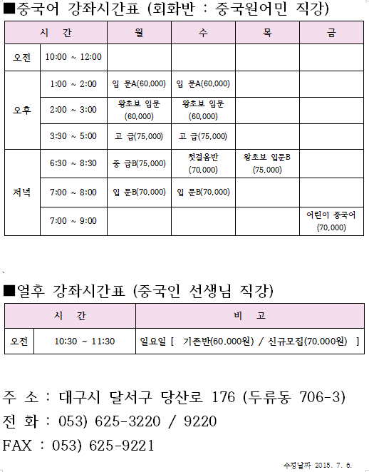 2015년 7월 중국어 & 얼후 강좌 시간표 페이지 정보 작성자 중국문화원 작성일15-07-06 17:39 조회5,956회 이전글 다음글 본문 기존의 토요 입문반은 폐강되었습니다. 토요 입문반 청강을 원하시는 분은 저희 문화원으로 연락주세요. 3인 이상 모집될 경우 반을 개설할 예정입니다. 이전글 다음글